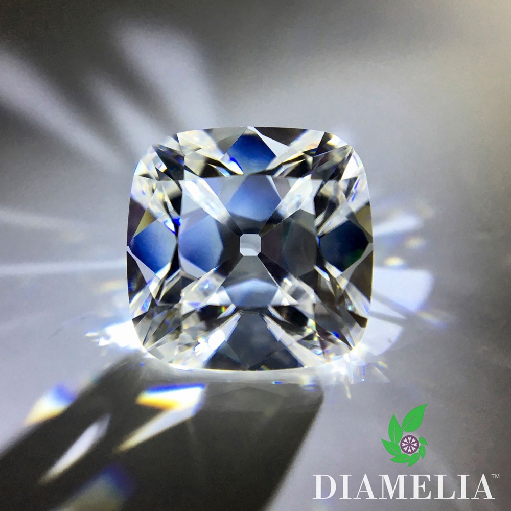 Our Antique Vintage Cushion DIAMELIA is the most beautiful and lasting diamond alternative in the world and we guarranty it. Beyond its sparkling beauty, this cut features our Tough Edge girdle and our exclusive Peace of Mind Lifetime Warranty. (DEW means Diamond Equivalent Weight)